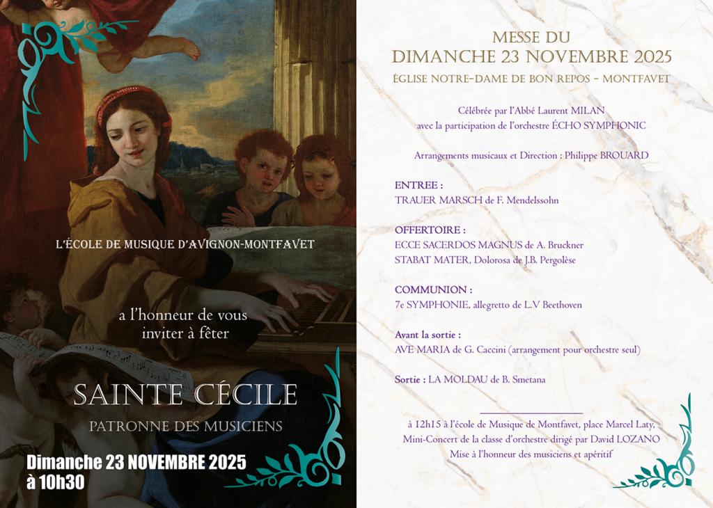 Le dimanche 23 novembre aura lieu notre traditionnel concert de la Sainte-Cécile durant la messe qui se tiendra à l’église Notre-Dame-De-Bon-Repos à 10h30 à Montfavet.